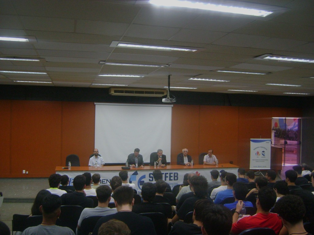 Junto deles, estavam presentes na mesa o Prof° Dr. Paulo Paupitz Gonçalves, o Prof° Dr. Enzo Barberio Mariano e o Prof° Dr. Edson Antonio Capello Sousa, que também conversou com os alunos sobre a Semana de Tecnologia e Ciências.