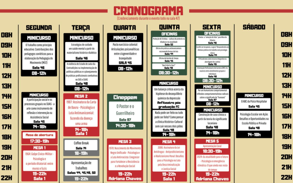 - Psicologia Escolar em Ação: Desafios e Oportunidades na Escola Pública e Privada após a Lei 13.935, com Laura Cunha Hanitzsch e Luiza Mari Mardiression, na sala 48.