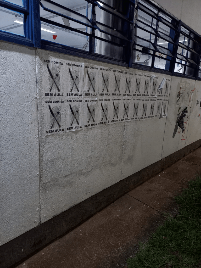 Ao entardecer, foi feita uma reunião nas dependências das salas 50, onde ficou decidido, após breve conversas realizar uma produção e colagem de lambes com a frase ‘sem comida, sem aula’ por toda a universidade, ato esse que contou com a ajuda de membros filiados aos coletivos dos movimentos Afronte e Correnteza.